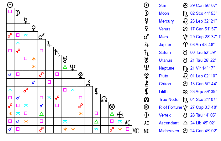 | Venus | 17 Cancer 52 | 21 Gemini 25 | 4 Scorpio 29 |