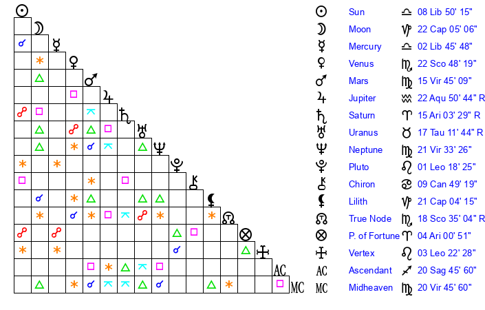 | Mars | 15 Virgo 45 | 7 Scorpio 2 | 10 Scorpio 26 |