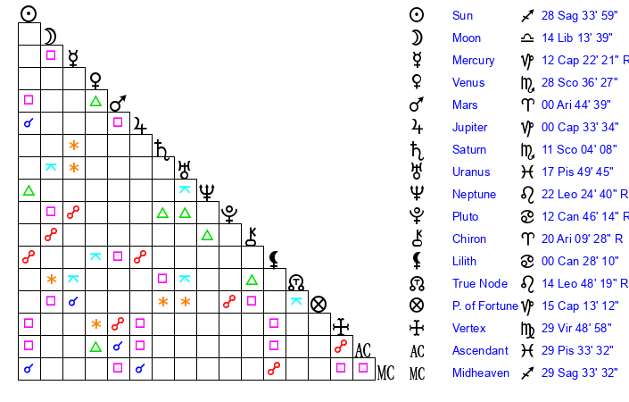 | Saturn | 11 Scorpio 35 | 25 Pisces 31 | 13 Scorpio 45 |