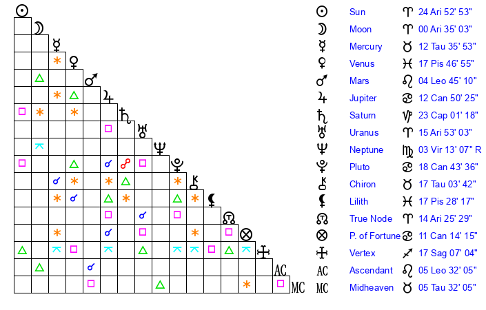 | Sun | 24 Aries 53 | 26 Aries 6 | 25 Cancer 12 |