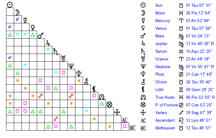 | Sun | 1 Taurus 7 | 1 Taurus 50 | 29 Cancer 24 |