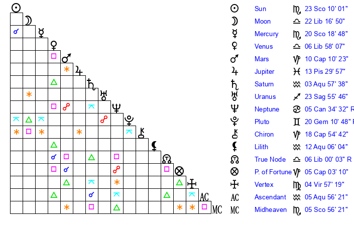 | Venus | 6 Libra 58 | 12 Scorpio 14 | 27 Aquarius 36 |