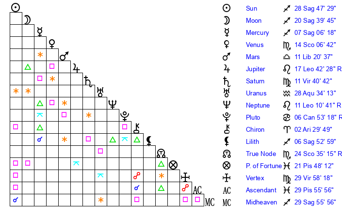 | Neptune | 11 Leo 10 | 29 Pisces 24 | 8 Leo 47 |