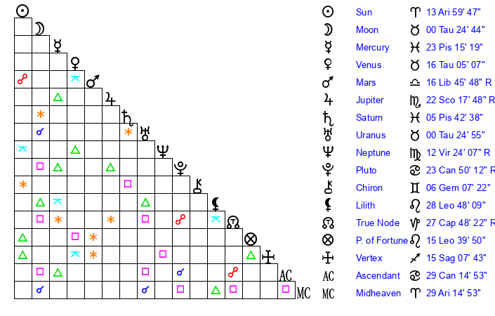 | Sun | 13 Aries 59 | 15 Aries 10 | 10 Cancer 49 |