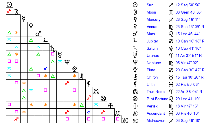 | Moon | 8 Gemini 45 | 24 Gemini 18 | 13 Sagittarius 0 |
