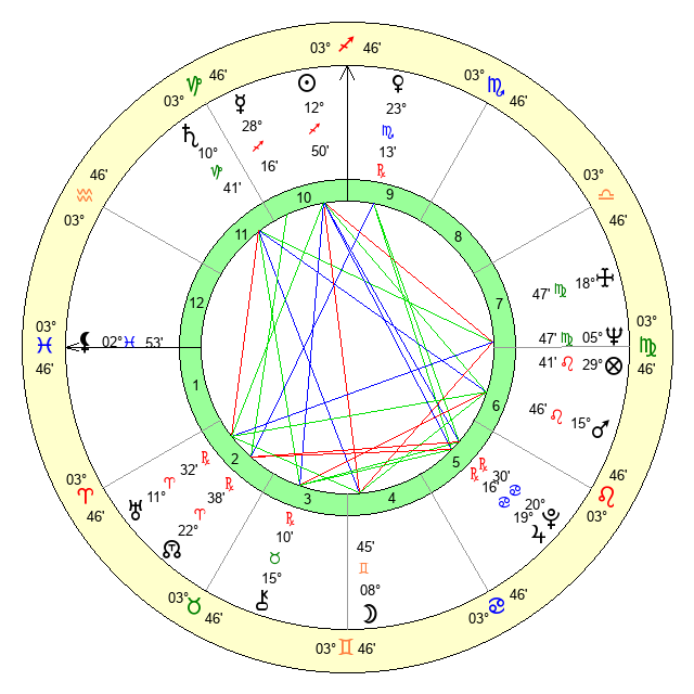 | Neptune | 5 Virgo 47 | 29 Pisces 22 | 4 Virgo 0 |