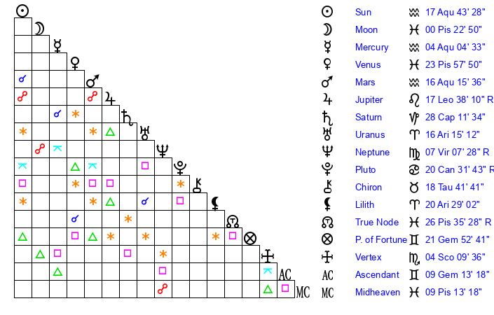 | Moon | 0 Pisces 17 | 19 Gemini 48 | 15 Cancer 17 |