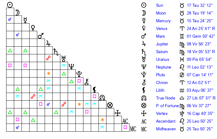 | Sun | 17 Taurus 32 | 18 Taurus 21 | 27 Leo 6 |