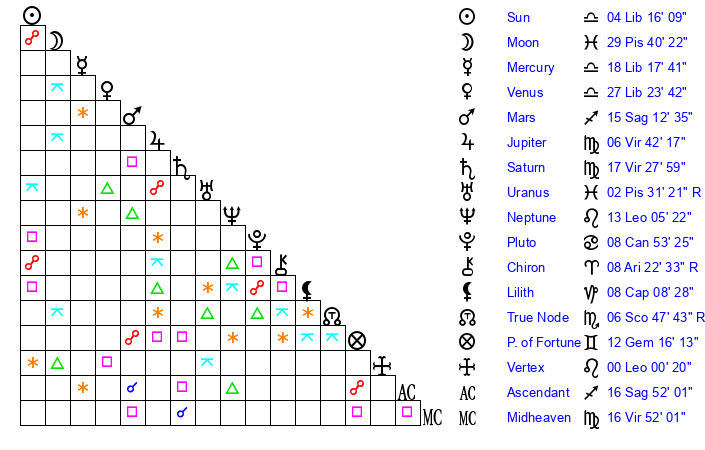 | Venus | 27 Libra 24 | 10 Virgo 1 | 4 Pisces 26 |