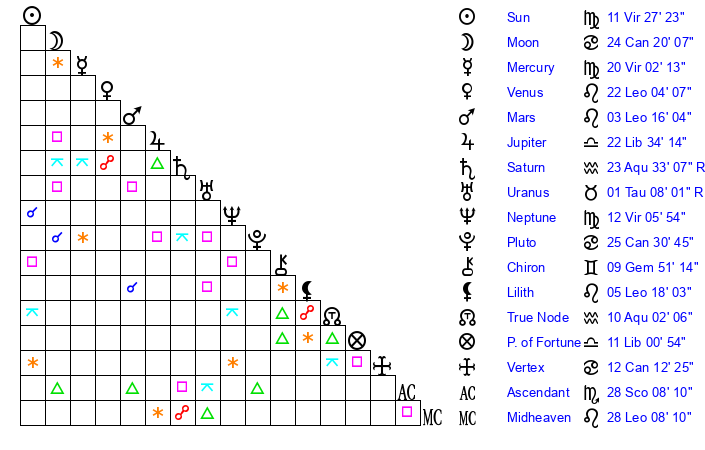 | Sun | 11 Virgo 27 | 12 Virgo 25 | 11 Sagittarius 52 |