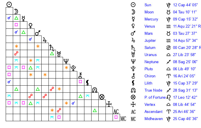 Moon | 4 Taurus 14 | 27 Aquarius 59 | 18 Pisces 57 |