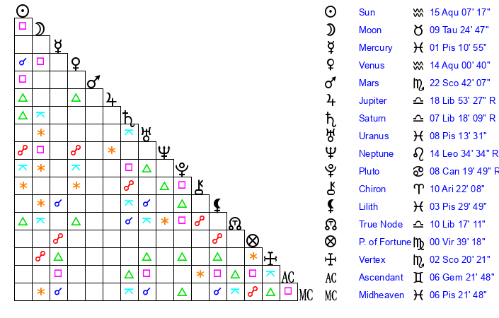 | Sun | 15 Aquarius 7 | 16 Aquarius 8 | 26 Taurus 57 |