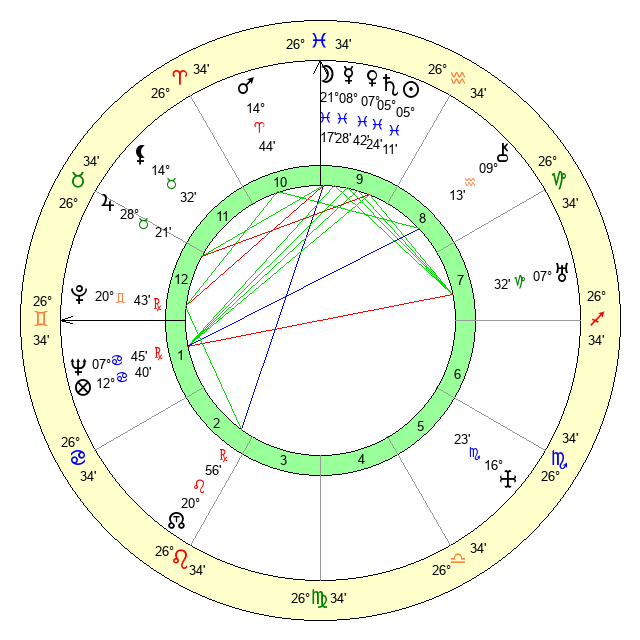 | Moon | 21 Pisces 12 | 22 Capricorn 44 | 20 Cancer 59 |