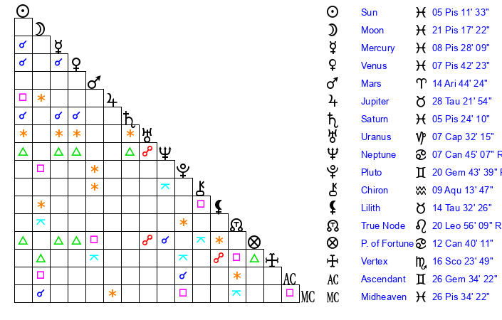 | Moon | 21 Pisces 12 | 22 Capricorn 44 | 20 Cancer 59 |