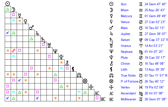 | Moon | 25 Aquarius 23 | 29 Aquarius 19 | 17 Leo 1 |