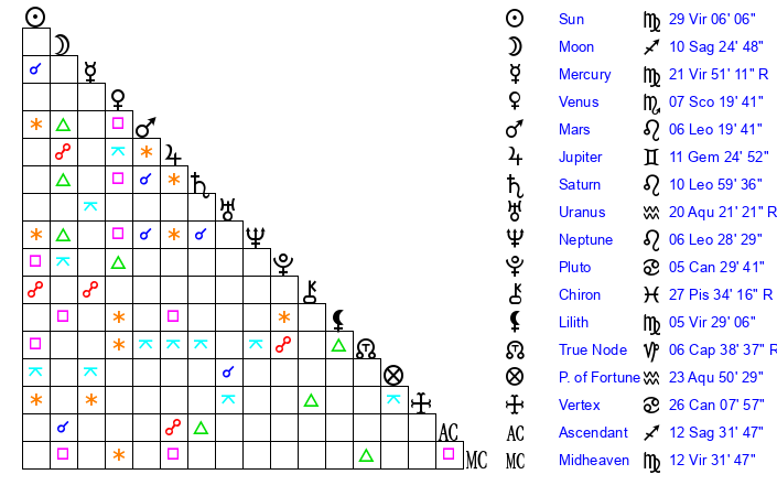 | Venus | 7 Scorpio 19 | 3 Virgo 53 | 25 Aquarius 57 |