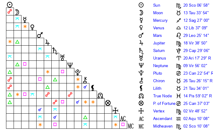 | Venus | 12 Libra 37 | 7 Scorpio 13 | 7 Aquarius 50 |