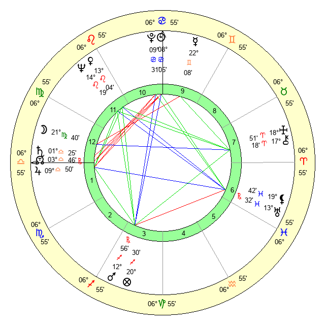 | Moon | 21 Virgo 42 | 15 Virgo 36 | 20 Gemini 55 |