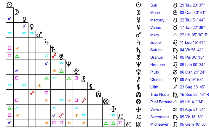 | Sun | 29 Taurus 20 | 29 Taurus 56 | 9 Virgo 53 |