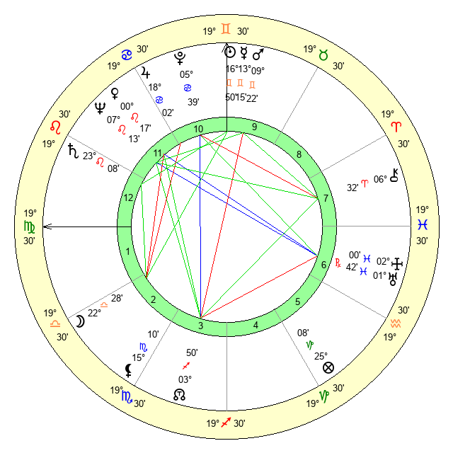 | Sun | 16 Gemini 50 | 18 Gemini 9 | 28 Virgo 37 |