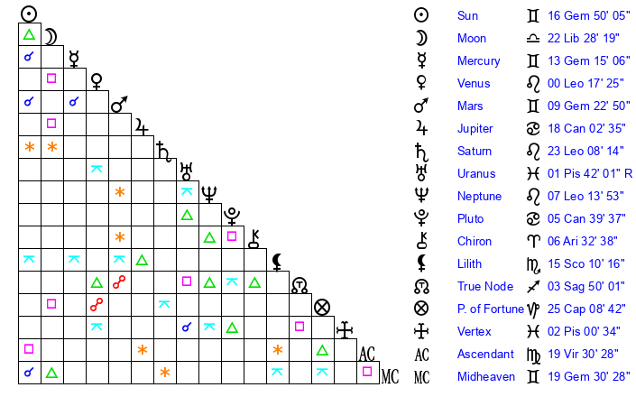 | Sun | 16 Gemini 50 | 18 Gemini 9 | 28 Virgo 37 |