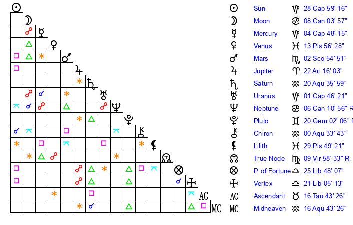 | Mercury | 4 Capricorn 48 | 16 Capricorn 43 | 2 Taurus 54 |