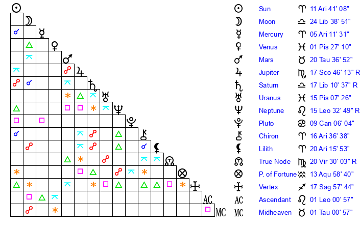 | Moon | 24 Libra 40 | 8 Gemini 51 | 13 Cancer 9 |