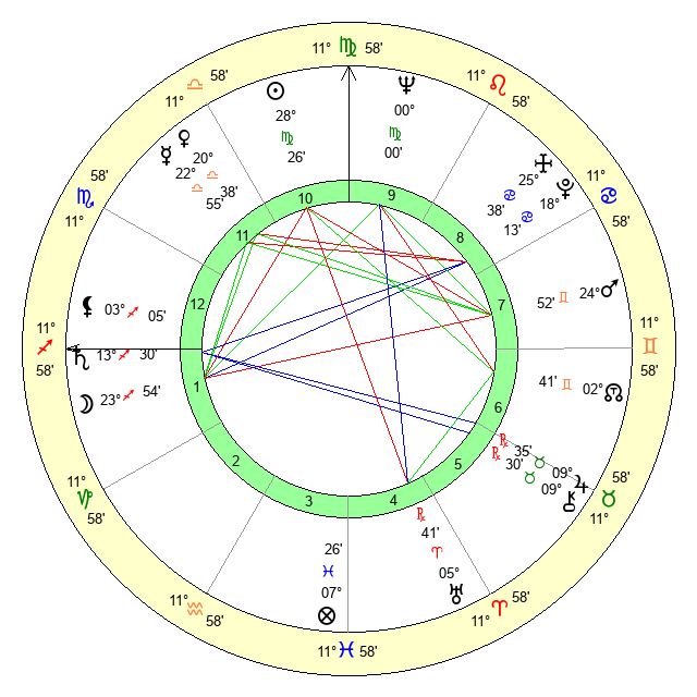 | Moon | 23 Sagittarius 56 | 27 Virgo 27 | 18 Cancer 7 |