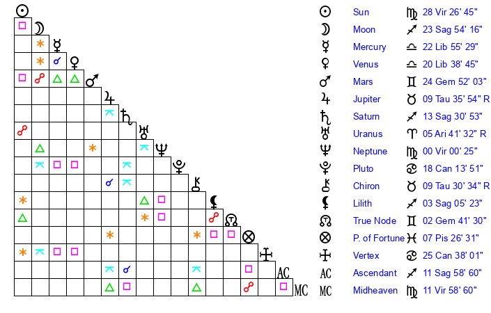 | Moon | 23 Sagittarius 56 | 27 Virgo 27 | 18 Cancer 7 |