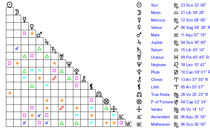 | Sun | 23 Scorpio 34 | 24 Scorpio 35 | 8 Pisces 5 |