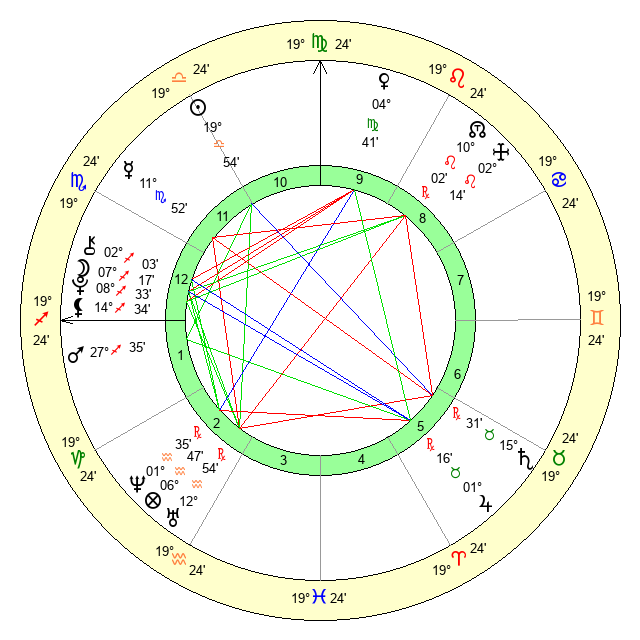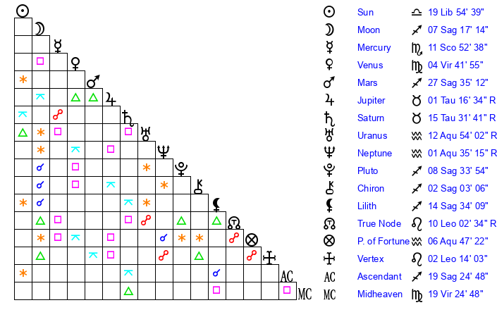 | Moon | 7 Sagittarius 24 | 19 Cancer 52 | 21 Scorpio 51 |