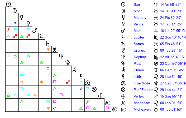 | Venus | 17 Taurus 17 | 25 Pisces 43 | 27 Leo 8 |