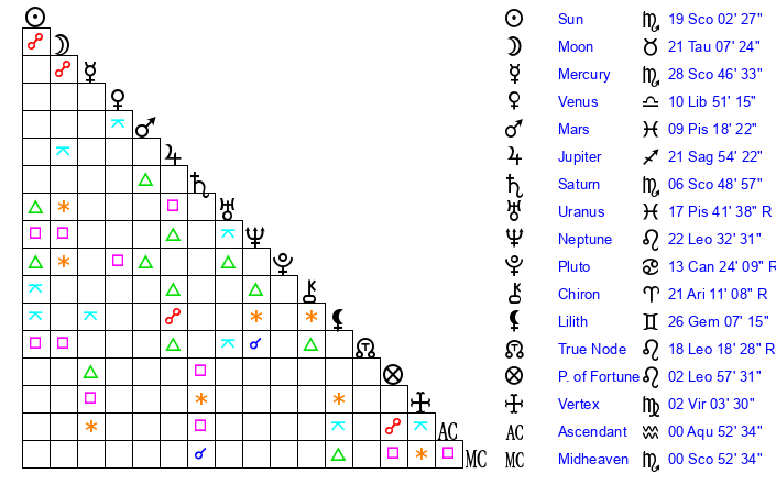 | Sun | 19 Scorpio 3 | 19 Scorpio 33 | 1 Pisces 34 |