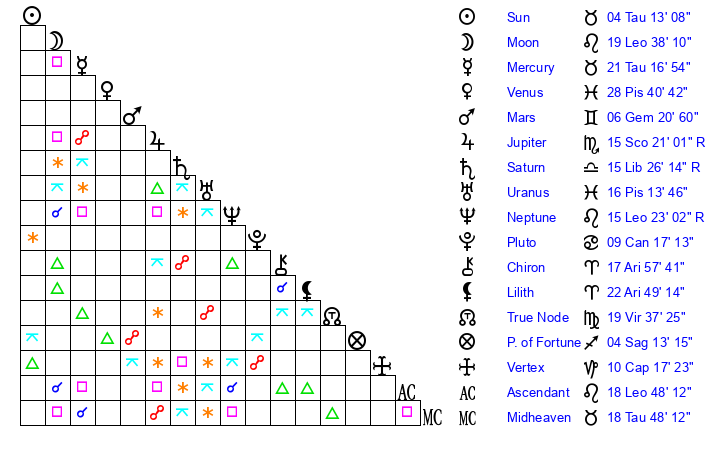 | Sun | 4 Taurus 13 | 5 Taurus 30 | 11 Leo 59 |