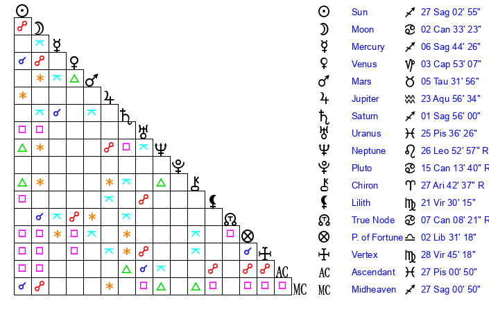| Sun | 27 Sagittarius 3 | 28 Sagittarius 17 | 6 Aries 2 |