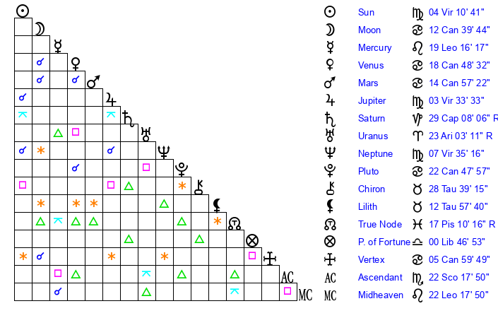 | Moon | 12 Cancer 35 | 25 Libra 50 | 15 Sagittarius 54 |