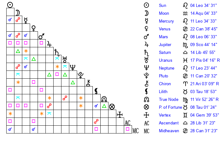 | Pluto | 11 Cancer 20 | 2 Aquarius 29 | 12 Cancer 15 |