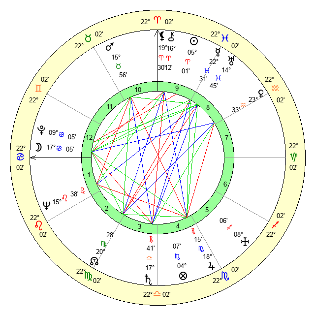 | Moon | 17 Cancer 2 | 28 Aquarius 29 | 20 Aries 23 |