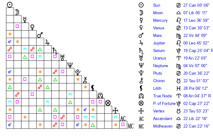 | Pluto | 20 Cancer 36 | 2 Aquarius 41 | 22 Cancer 10 |