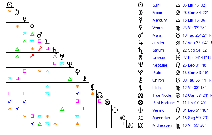 | Saturn | 23 Scorpio 22 | 27 Pisces 40 | 4 Sagittarius 21 |