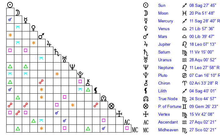 | Venus | 21 Libra 57 | 1 Sagittarius 5 | 27 Aquarius 37 |