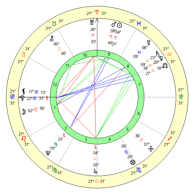 | Sun | 4 Aries 21 | 5 Aries 18 | 2 Cancer 28 |