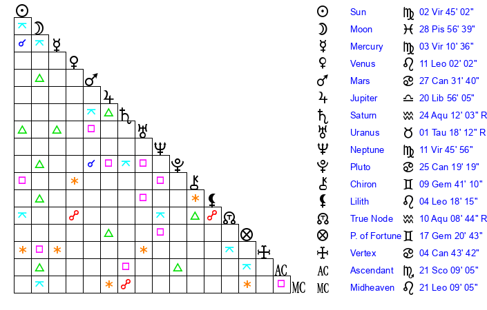 | Sun | 2 Virgo 45 | 3 Virgo 42 | 2 Sagittarius 45 |