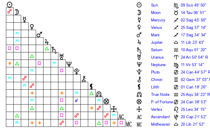 | Sun | 9 Scorpio 50 | 10 Scorpio 31 | 13 Aquarius 11 |
