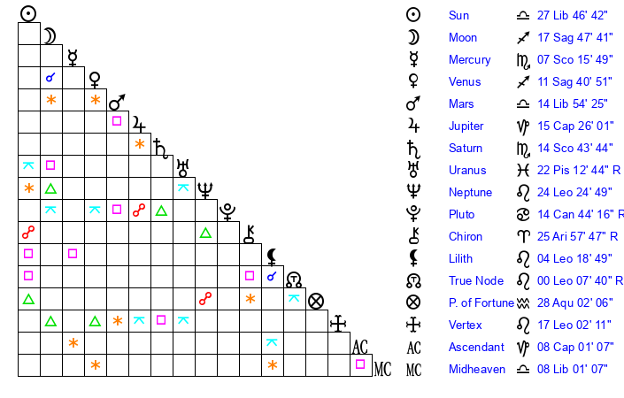 | Moon | 17 Sagittarius 43 | 0 Scorpio 35 | 17 Leo 45 |