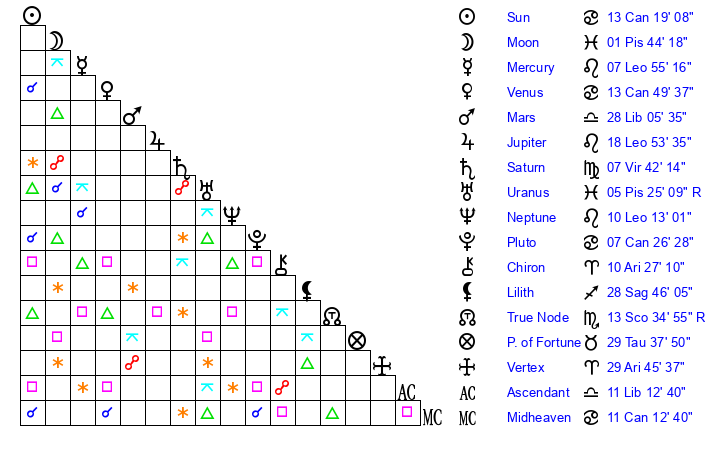 | Venus | 13 Cancer 50 | 1 Gemini 10 | 23 Scorpio 14 |
