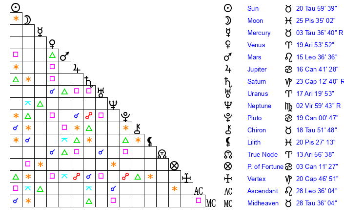 | Venus | 19 Aries 54 | 8 Aries 2 | 14 Leo 15 |