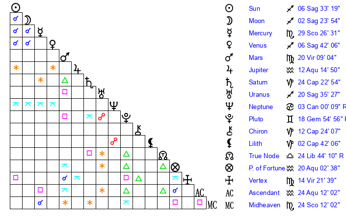 | Uranus | 20 Sagittarius 33 | 29 Taurus 7 | 25 Sagittarius 35 |
