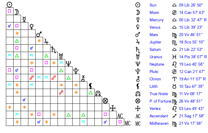 | Saturn | 21 Libra 57 | 27 Pisces 26 | 2 Scorpio 13 |