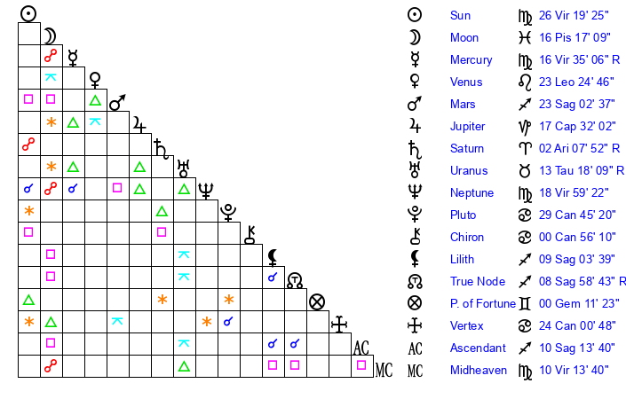 | Sun | 26 Virgo 19 | 27 Virgo 0 | 24 Sagittarius 20 |
